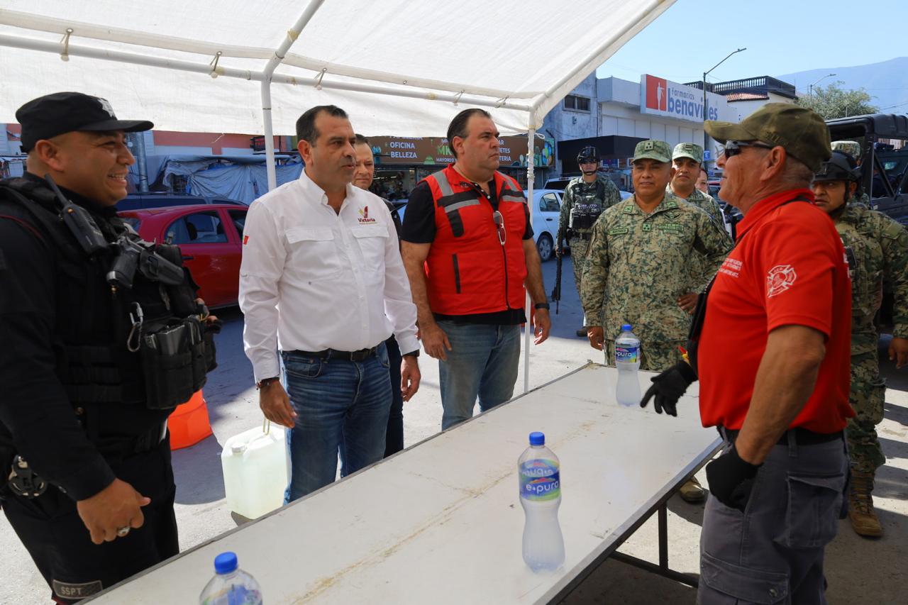 El secretario del Ayuntamiento, Hugo Reséndez Silva, acompañado de mandos militares y de seguridad, recorrió áreas clave de la ciudad y se dirigió al Centro de Mando instalado en la plaza Hidalgo, donde dialogó con comerciantes y consumidores para conocer su percepción sobre la presencia de las fuerzas de seguridad.