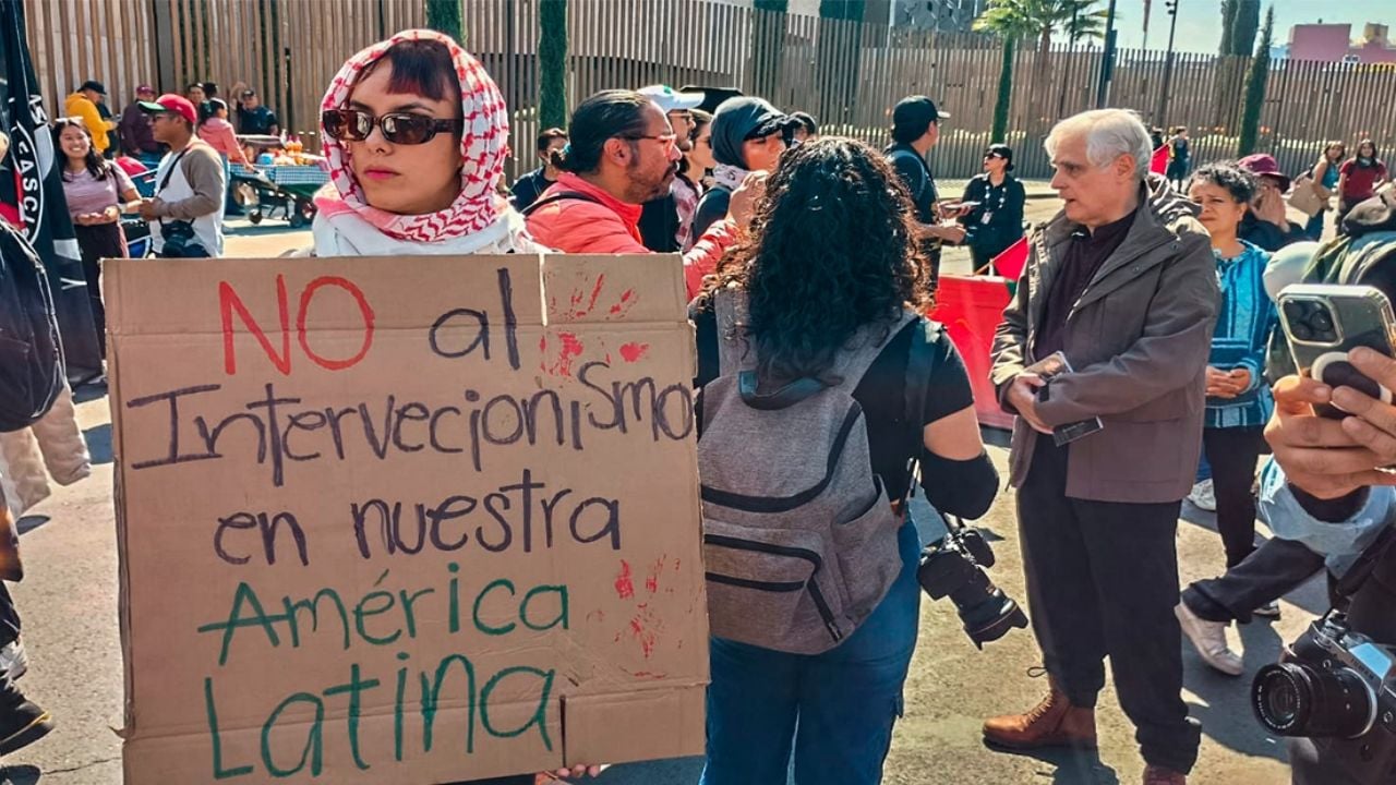 Un grupo de aproximadamente 250 personas se reunió afuera de la nueva embajada de Estados Unidos en la Ciudad de México para manifestarse contra las recientes acciones militares de la Casa Blanca en Venezuela.