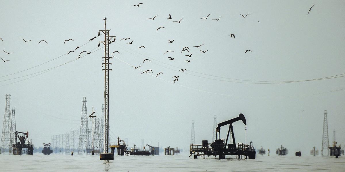Plataforma petrolera en Venezuela al atardecer con el mar