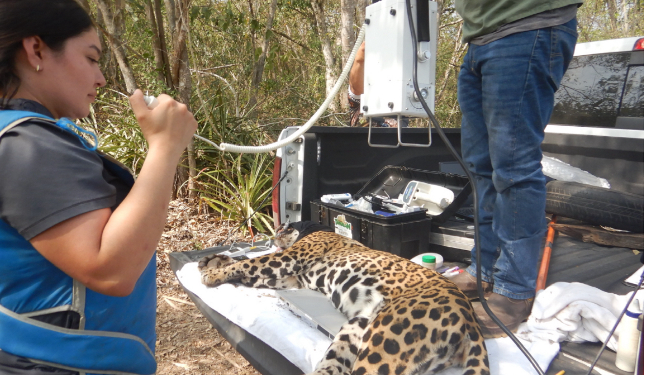 Como parte del protocolo de manejo, el equipo veterinario realizó la evaluación clínica integral del ejemplar, aplicando anestesia para su manejo en campo. Se efectuó el pesaje (40.250 kg), estudios con equipo de diagnóstico portátil (rayos X y ultrasonido), toma de medidas morfométricas, extracción de muestras biológicas (sangre y pelo), así como el registro del patrón de manchas y huellas, fortaleciendo la información técnica del programa estatal.